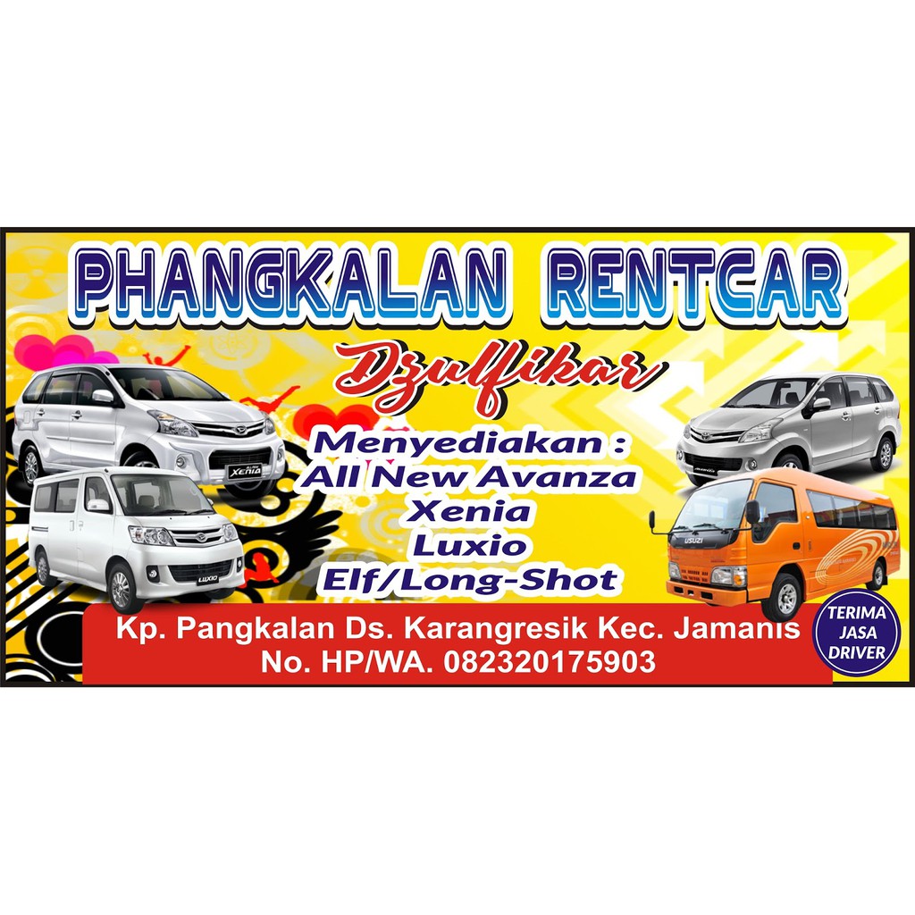 Pilih dari 350+ templat yang menarik untuk membuat audiensi . Harga murah di lapak wijaya store. Pembuatan berbagai media iklan seperti banner brosur logo website dl . Kali ini saya akan posting contoh spanduk rental mobil, saya kira jasa persewaan mobil saat ini sedang bergeliat, seiring dengan semakin . Slogan rental mobil, contoh promosi travel, contoh spanduk rental.